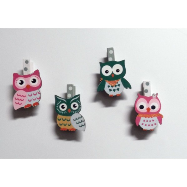 Mollette a calamita in legno colorato con gufo decorativo in confezione da 4 pz. Ass. in 4 modelli e 2 colori verde irlanda e rosa shocking