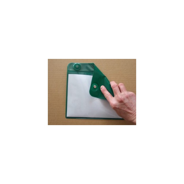 Tasca magnetica, misura cm 15 x cm 21, con apertura sul lato verticale o sul lato orizzontale a seconda delle necessità. Parte anteriore in PVC trasparente e parte posteriore in Pvc verde, dotata di due magneti al neodimio di mm 10. Per ordini superiori a 200 tasche, possono essere fornite con quattro magneti al neodimio.